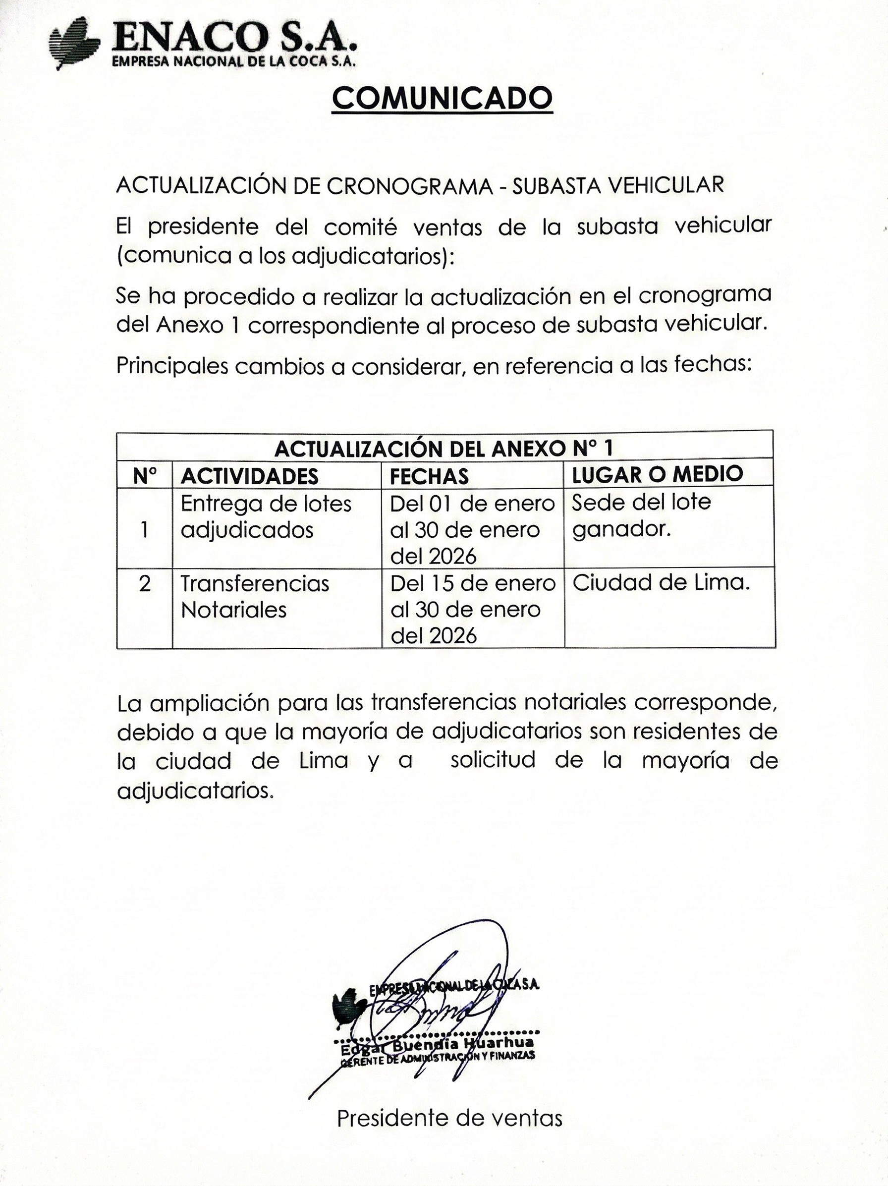 ACTUALIZACIÓN DE CRONOGRAMA - SUBASTA VEHICULAR , PARA LOS ADJUDICATARIOS.