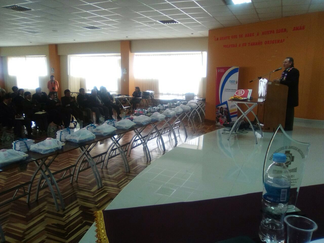 El Fondo Nacional de Desarrollo de la Educación Peruana – FONDEP, la Unidad de Gestión Educativa Local de Puno – UGEL y la Dirección Regional Educativa de Puno – DREP premiaron a las 15 Instituciones Educativas ganadoras del I Concurso Regional Experiencias Pedagógicas Innovadoras en el marco del Proyecto Curricular Regional y la Buenas Prácticas Educativas “Innovando Saberes para el Buen Vivir”. Estas escuelas fueron elegidas entre 50 instituciones educativas evaluadas bajo criterios de intencionalidad, reflexión, creatividad, pertinencia, participación, impacto y sostenibilidad. A la ceremonia de premiación, realizada en el auditorio de la Dirección Regional de Educación de Puno, asistió el Gerente Ejecutivo de FONDEP, Dr. Fidel Rojas Luján, quien se dirigió a los maestros innovadores con un mensaje motivador. FONDEP felicitó a las 15 II.EE ganadoras con la entrega de un diploma de Honor, un Módulo de formación virtual en Sistematización de Experiencia Educativas así como la futura publicación (virtual) de las sistematizaciones de sus experiencias educativas; mientras que, a los cinco primeros lugares obsequió una cámara filmadora y una laptop. Cabe resaltar, que este concurso buscó incentivar la participación de instituciones educativas públicas de Educación Básica Regular de la región, a través de la presentación de sus experiencias innovadoras y buenas prácticas educativas que ayuden a fortalecer los aprendizajes creativos de las y los estudiantes En el evento también estuvieron presente el Coordinador Territorial del MINEDU, Gabriel Soplín; el Gobernador del Puno, Juan Luque; el Director de la DRE Puno, Mg Felipe Carpio y otras autoridades, así como directores y docentes de las II.EE ganadoras.