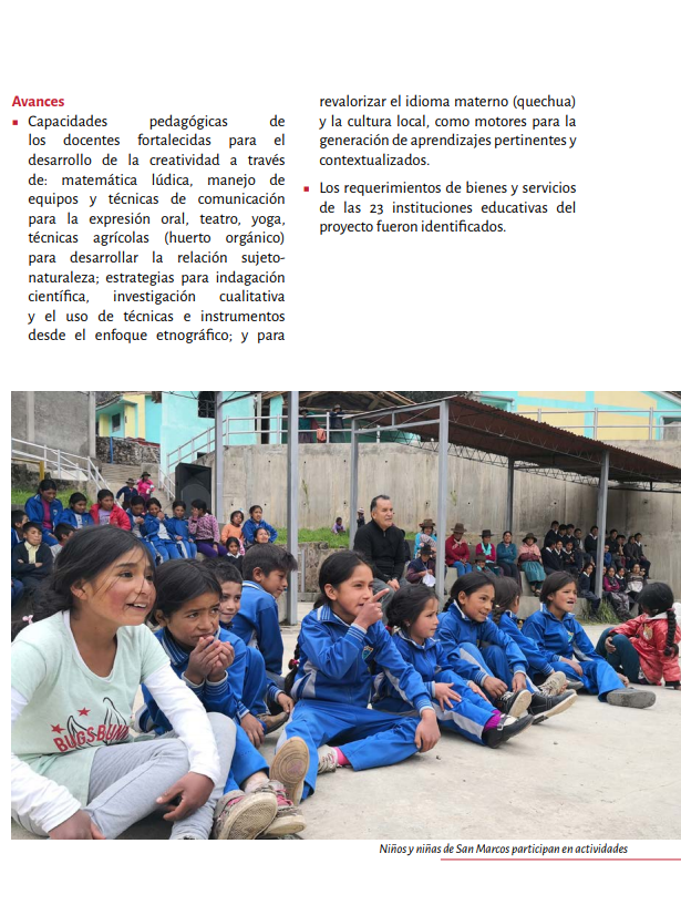 Como parte de su línea de acción sobre innovación educativa, la Organización de las Naciones Unidas para la Educación, la Ciencia y la Cultura (UNESCO) publicó en su Informe Bianual 2016-2017, los avances del proyecto realizado junto al Fondo Nacional de Desarrollo para la Educación Peruana (FONDEP), sobre el Modelo de Laboratorios de Innovación Educativa (LIE) en San Marcos, Áncash.