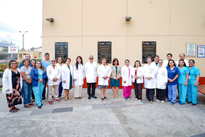 Para la develación de la placa del 100 por ciento acompañaron a la doctora Tomas, la Dra. Ruth Rojas, Dra. Katia Granados, Dr. Víctor Trigoso, Lic. Celeste Venga y Lic. Fabiola Lévano, algunos de los que fueron parte del equipo de gestión que contribuyó a alcanzar este logro institucional, en menos de tres años.