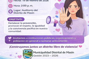 La Municipalidad Distrital de Masin, a través de las instancias correspondientes, informa a la ciudadanía que se llevará a cabo el taller “Prevención de la Violencia contra la Mujer y los Integrantes del Grupo Familiar”, con el objetivo de fortalecer la sensibilización, la prevención y la articulación interinstitucional frente a esta problemática social.