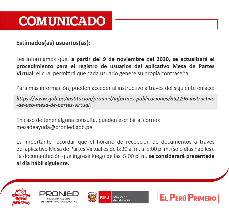 Comunicado PRONIED: Sobre la actualización del aplicativo Mesa de Partes Virtual