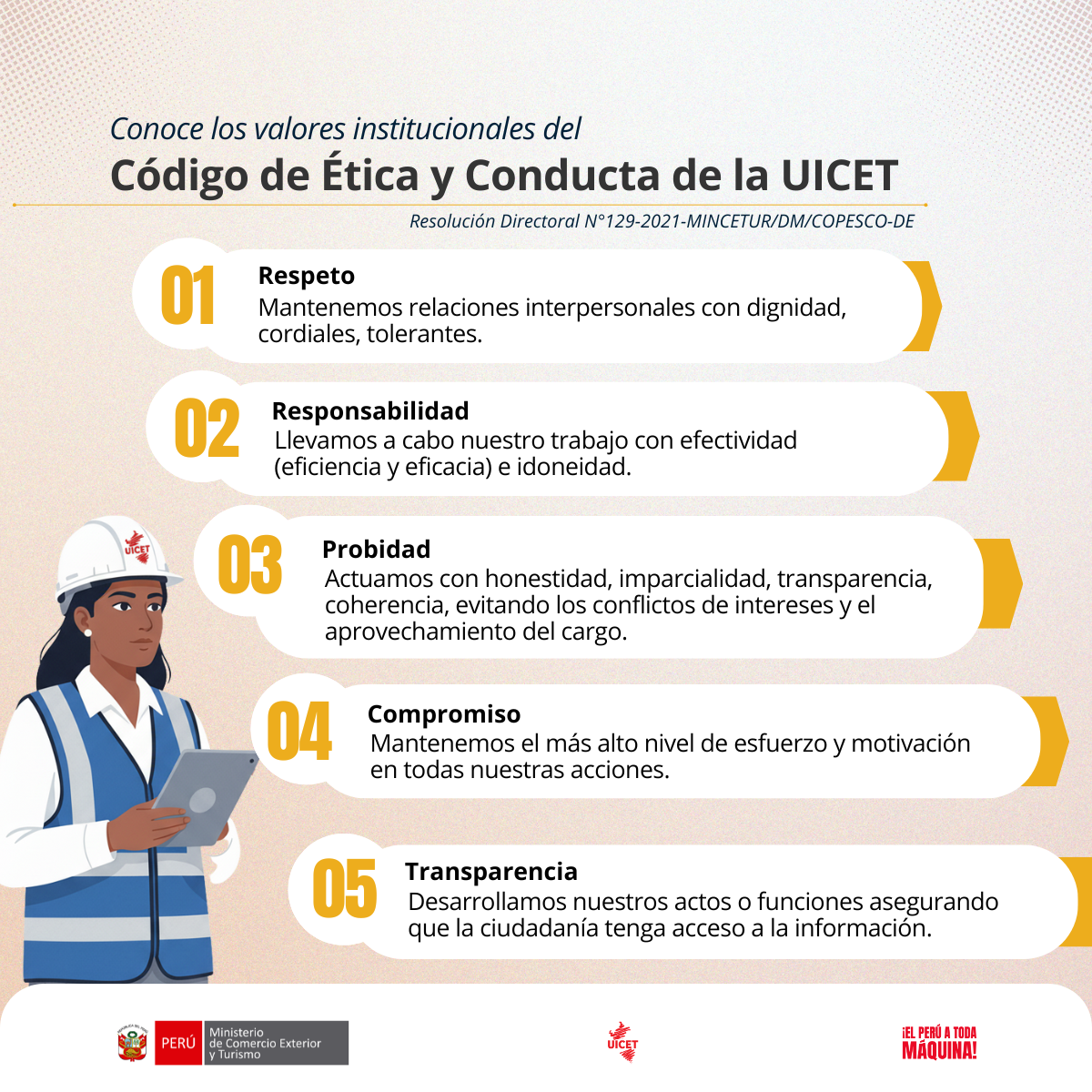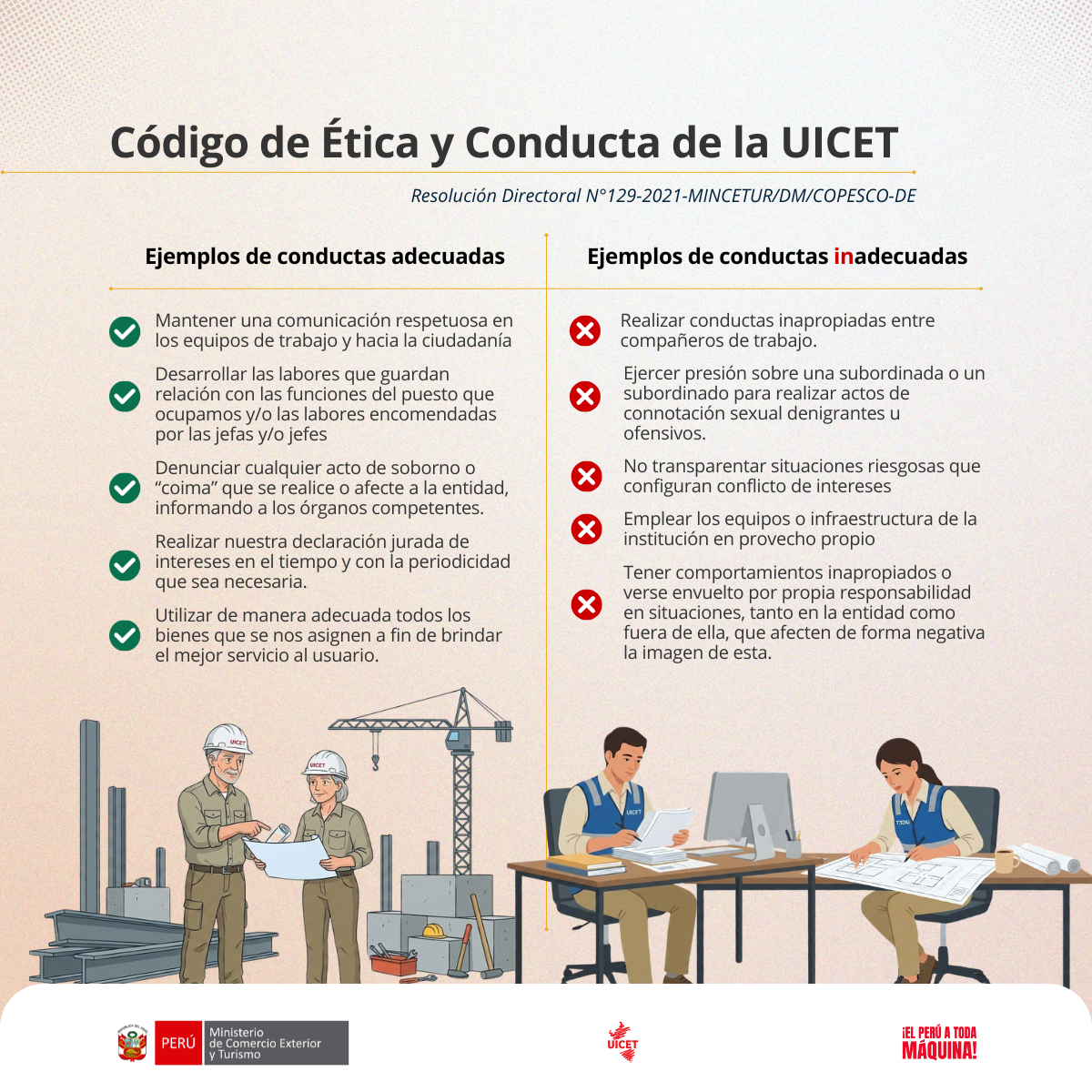 Unidad Ejecutora de Inversión en Comercio Exterior y TurismoVI) Código de Ética y ConductaFormulario29 de enero de 2026Código de Ética y ConductaEsta publicación pertenece al compendio Integridad en UICETCÓDIGO DE ÉTICA - VALORES INSTITUCIONALESPNG1.5 MB DescargarCÓDIGO DE ÉTICA-EJEMPLOS DE CONDUCTASPNG2.7 MB DescargarCÓDIGO DE ÉTICA-VALORES INSTITUCIONALES 2PNG2.5 MB DescargarCÓDIGO DE ÉTICA Y CONDUCTA DE PCNPDF1 MB Descargar